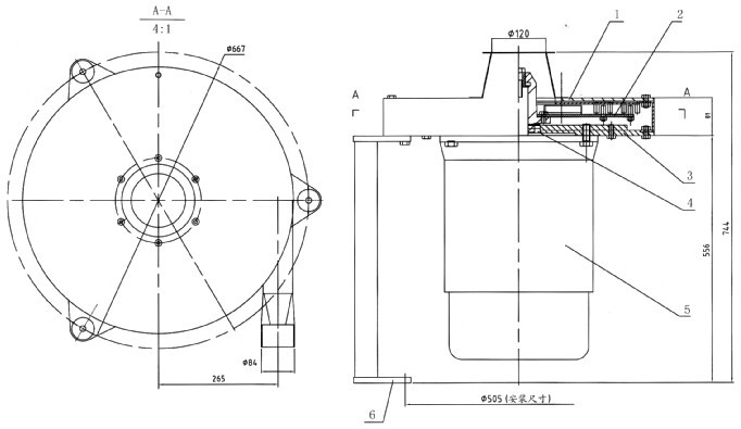 1、殼體 2、甩盤(pán) 3、外殼 4、密封件 5、電機(jī) 6、安裝腳